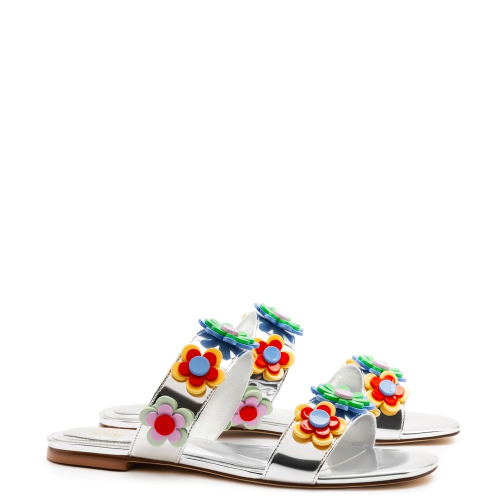 This mirrored metallic slide is a walking work of art with playful floral appliquée across the straps in the spirit of Spring. Featurs flowers inspired by Gabriela’s unique acrylic sculptures.