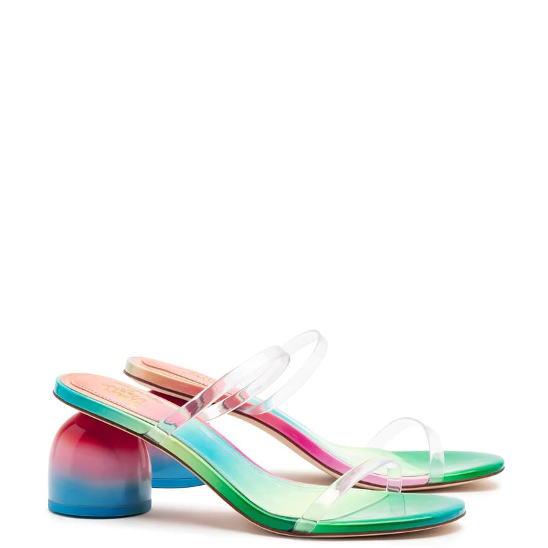 The “Dew Drop”Mule is inspired by the organic shapes and unique gradients used in Gabriela’s Toadstool Series and textile created for Mathieu Lehanneur’s Familyscape sofa. It features a gradient inspired by Miami in the Art Deco and Post Modern movement.